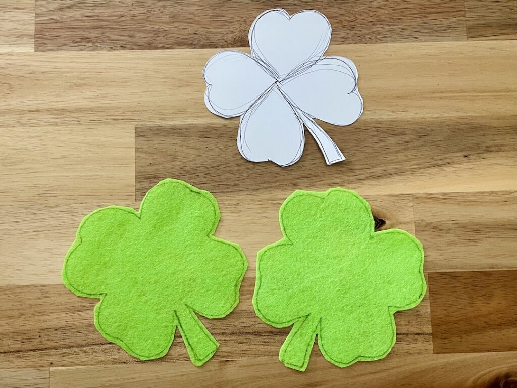 To jazz it up, I used some green felt and thread to shape the bean bags like 4-leaf clovers. Each team had 3 bean bags, and I had marked where they had to stand to make the throws.