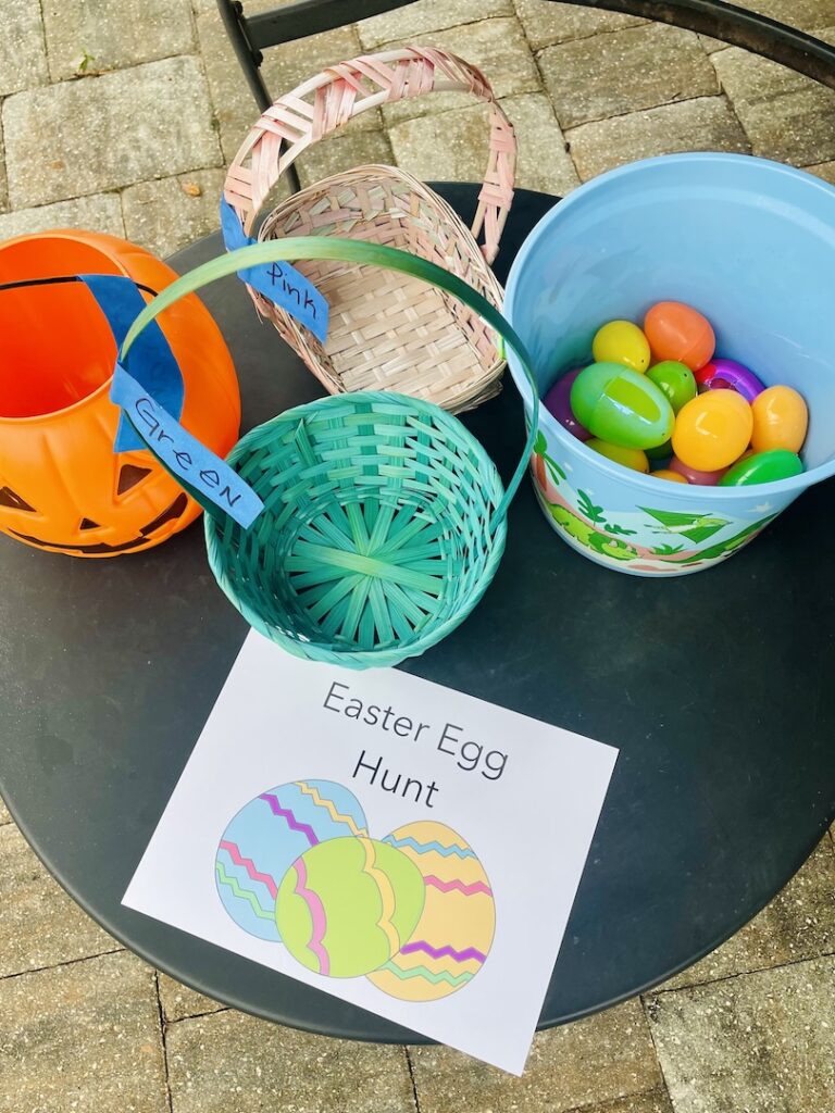 With 4 containers – the boys’ Easter Baskets, and a Halloween bucket – I labeled each with a color. The team member for this game needed to find 4 eggs of that color within a designated area.