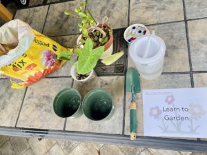I chose a couple of elephant ear clippings that I had been letting root for a week. We set up some small pots, a bag of soil, shovel and a pitcher of water.