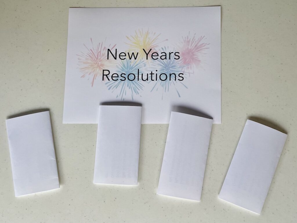 I decided on four different, common, New Year’s Resolutions and created an activity for each. As teams reached this table, one member would pick up an envelope to determine which resolution they would be tackling. Directions for each would be clearly written, and one person on the team needed to complete the task before moving to the last event!