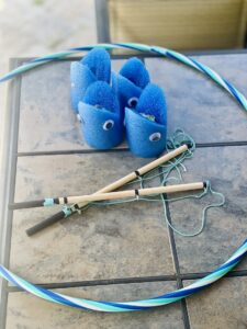 We have a kiddie pool, but I wanted to make it a little more challenging, so I tied a rope to a hula hoop and attached that rope to some weights on the side of the pool to keep it floating in one spot. Then, I just tossed the fish into the hoop.
